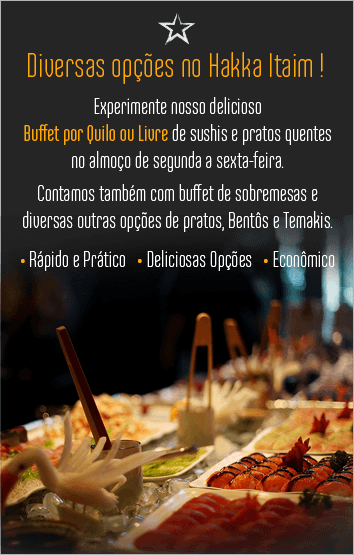 Em nosso Buffet de Almoço por Quilo (Kg), de segunda a sexta no horário do almoço, oferecemos as inovadoras especialidades do sushiman, além de pratos quentes variados da culinária oriental. Caso opte por nosso completo Festival, sirva-se à vontade em nosso delicioso buffet de sobremesas.